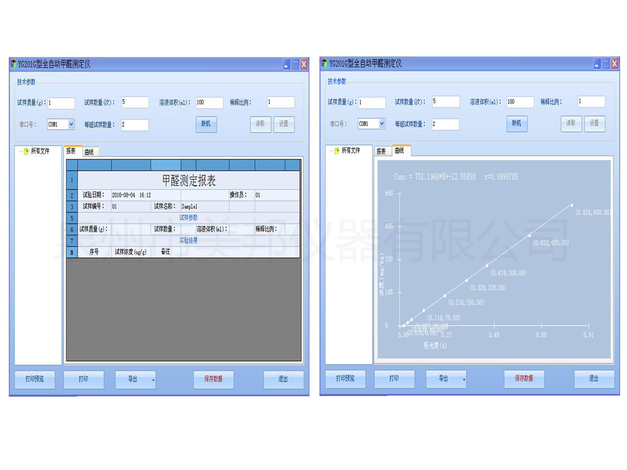 1、采用萃取法,按照國家標準方法可同時測出甲醛測定值、吸光度值和透過率值。