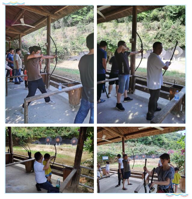 下午全體徒步到射箭區(qū)域、體驗(yàn)射箭,拉弓、瞄準(zhǔn)靶心、放箭,射箭不僅考驗(yàn)眼力,也很考驗(yàn)臂力,體驗(yàn)完射箭,途徑過蕩秋千區(qū),蹺蹺板,木樁等游樂設(shè)施,大家也玩得很開心,繼續(xù)前行,到達(dá)高空滑索體驗(yàn)區(qū),每個(gè)人興奮不已,體驗(yàn)速度與激情。