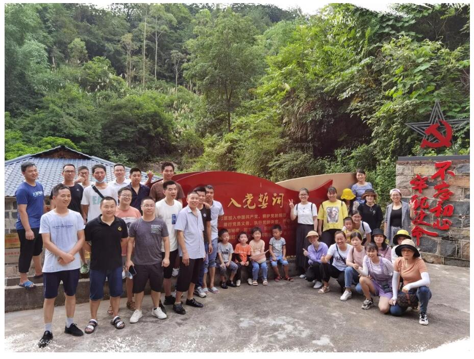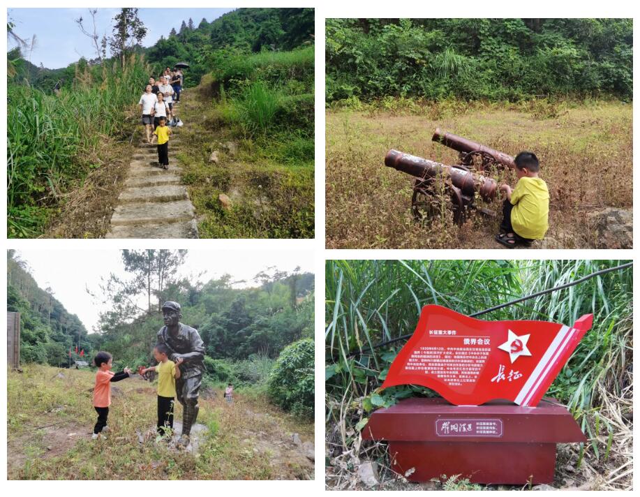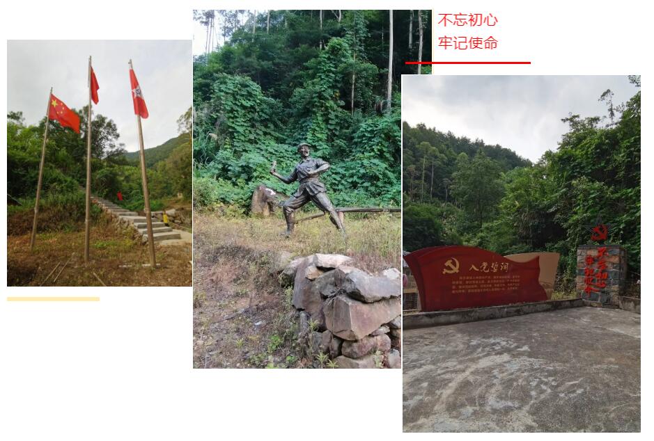 路的兩旁每隔一段路程,豎立著長(zhǎng)征重大事件歷史記錄,紅軍革命歷史博物館外圍豎立著三面旗幟,隨風(fēng)飄蕩,讓人肅然起敬,往里走,有座土石疊成的房子,大門上掛著牌匾—【長(zhǎng)征故事】,房子旁豎立著“不忘初心、牢記使命”以及“入黨誓詞”,之后我們進(jìn)行全體合照。