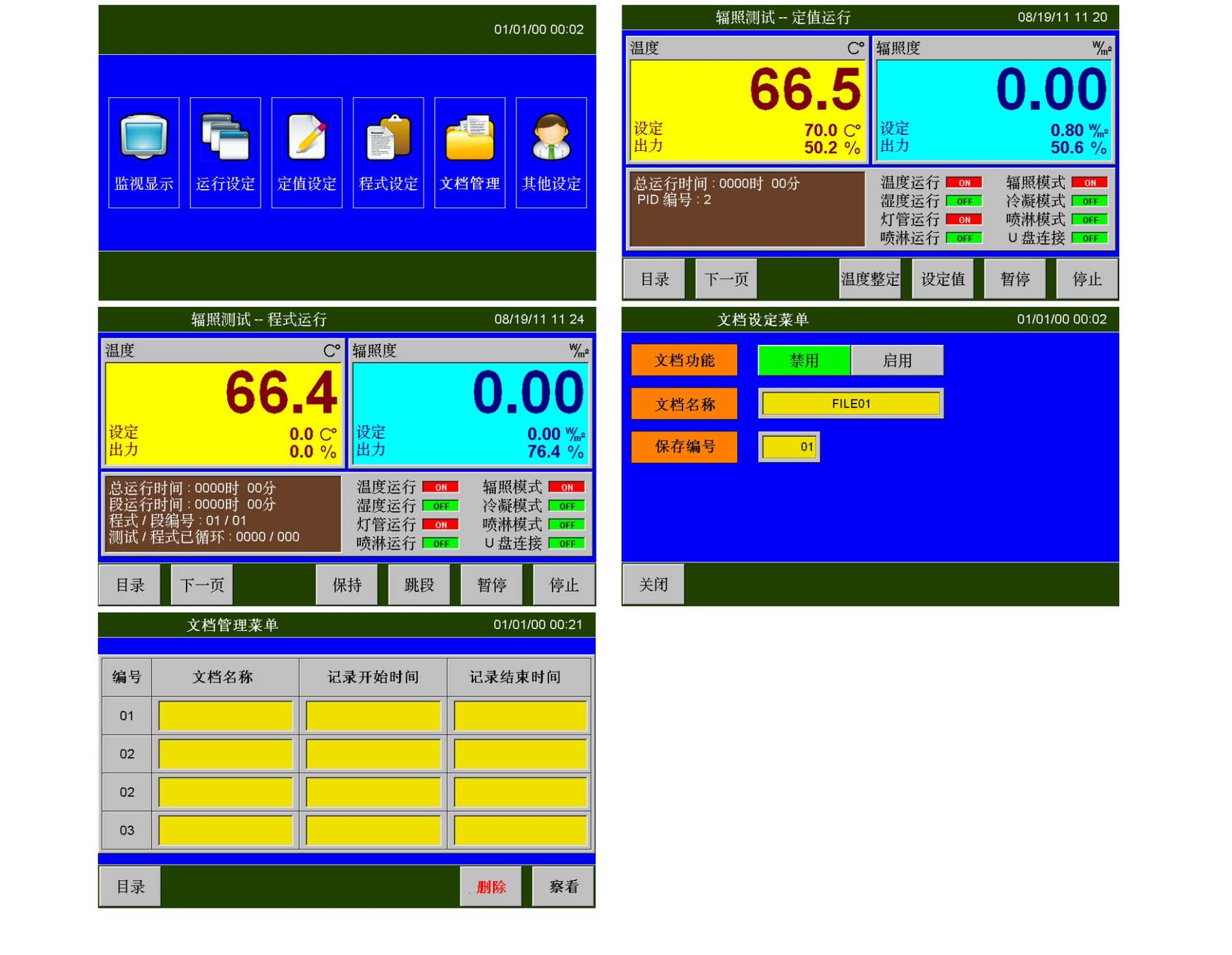 用戶可以使用本功能實(shí)現(xiàn)連續(xù)紫外試驗功能。在定制運(yùn)行畫面中,用戶可以手動控制各功能的開啟與關(guān)閉。在此畫面,可實(shí)現(xiàn)溫度整定,具有溫度自動演算功能。